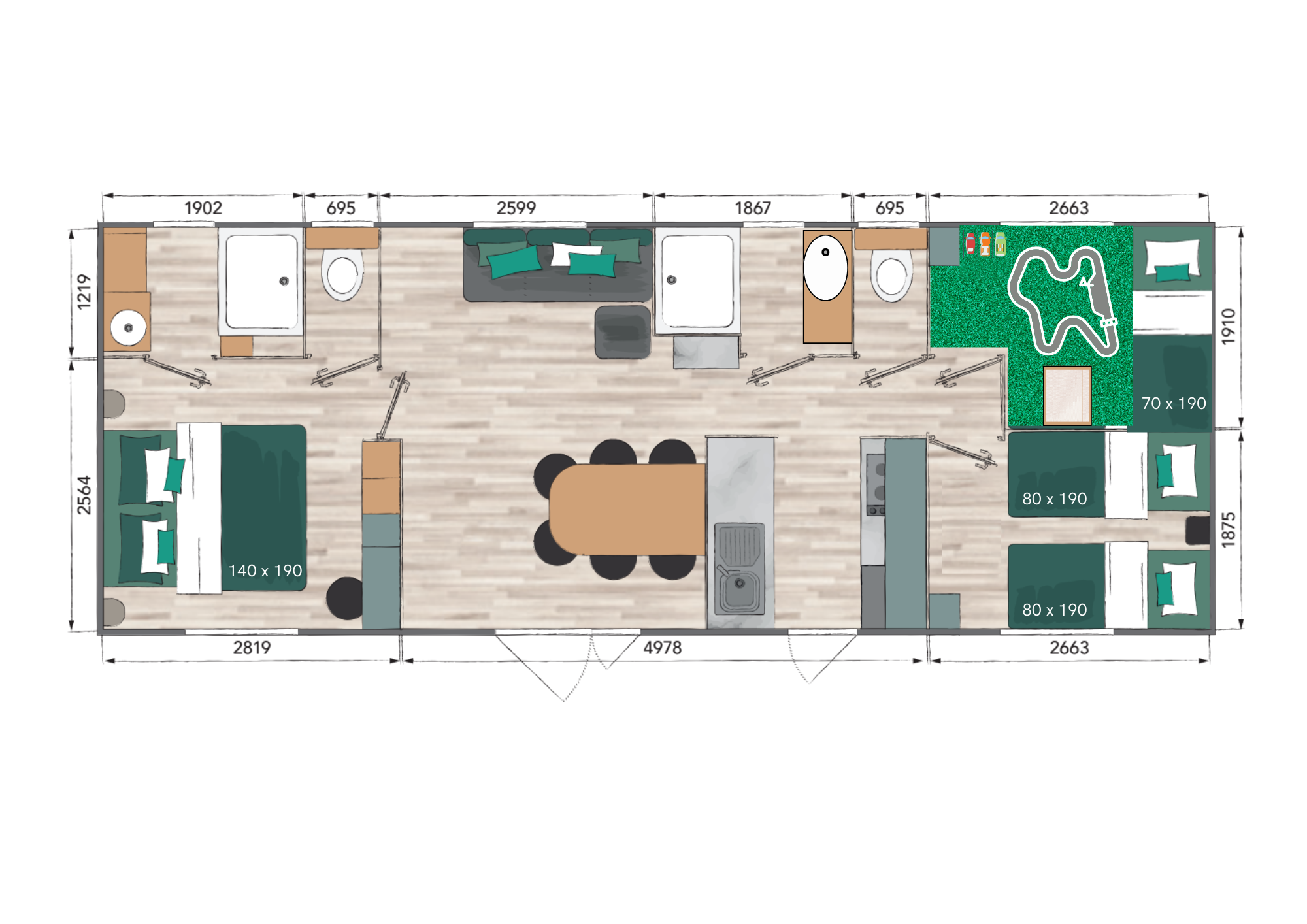 Pensé pour les familles, ce mobil-home propose un coin parental avec chambre lit double, salle d’eau et WC séparés et un coin enfants avec 2 chambres, une salle d’eau avec grand lavabo / baignoire bébé. Un WC séparé avec abatant de toilettes adapté aux plus petits.