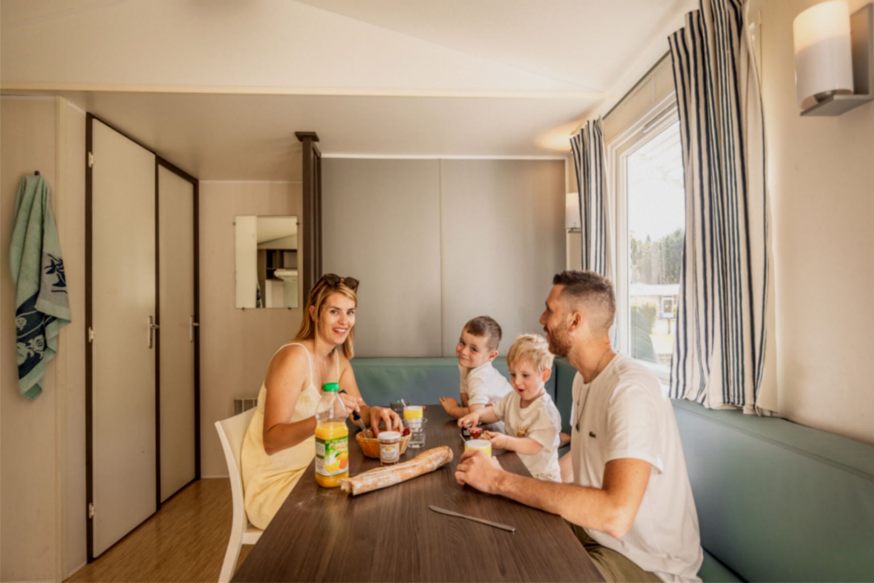 • Woonkamer met bank, eettafel, kachel en flatscreen-tv